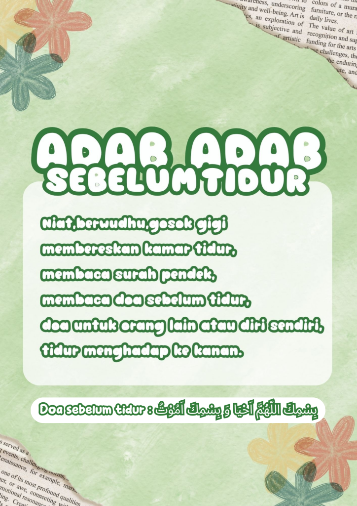 The etiquette before sleeping is a good habit encouraged in Islamic teachings. One of them is to perform ablution (wudu) beforehand so that one sleeps in a state of purity. In addition, reciting a bedtime prayer such as “Bismika Allahumma ahya wa amuut” is also recommended.