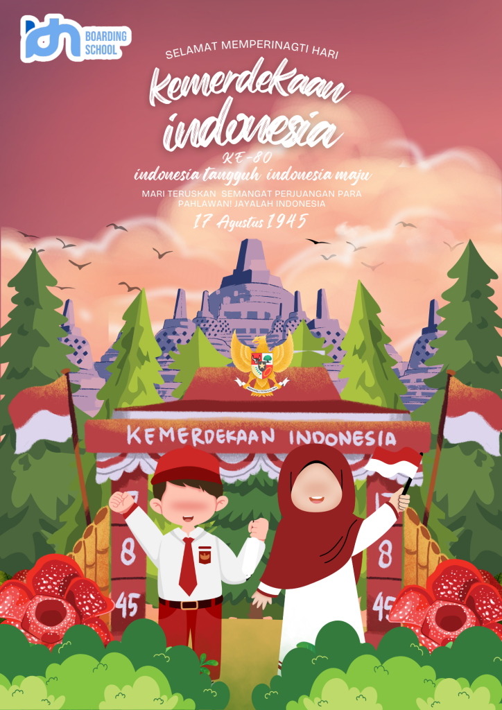 Hello everyone, this poster tells about Indonesian independence, I made this design using the Canva application. And the poster I made has the theme “Happy 80th Indonesian Independence Day. Strong Indonesia, Advanced Indonesia. Let’s continue the spirit of the heroes’ struggle! Long live Indonesia” August 17, 1945. And also I made this poster the size of an A4 document. For the design I made, I used the font: Borobudur temple, trees, bushes, rafflesia flowers, Garuda birds, birds, clouds, fog