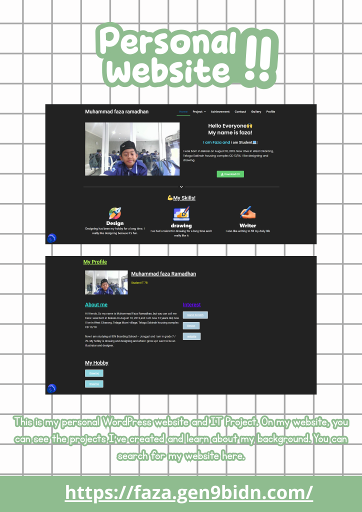 this website, is an IT Project. why is it really important? because, in ninth grade / third-year, we’ll make a portfolio and a CV (curriculum vitae) also, every time we finish a project, we upload it here, in our personal website. we also have other things here such as our achievements, contacts, gallery, information, etc.